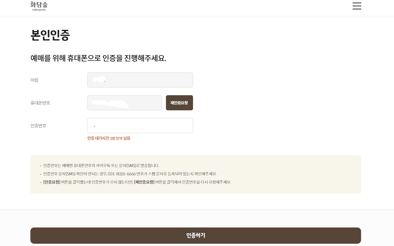 본인인증을 위해 인증번호를 카톡으로 보내줍니다. 저는 카톡링크를 타고 바로 예매사이트로 들어갔더니 인증번호를 보기 위해 카톡화면을 넘겨버렸더니 처음 대기화면으로 다시 돌아가더군요.