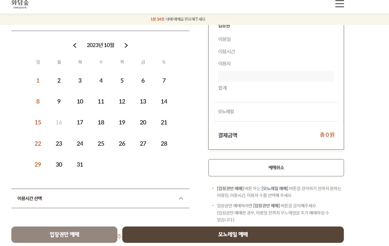 예약가능일이 10월 20일부터 11월 12일이라고 보통 말씀하사던데 지금날짜도 예매도 가능합니다. 단풍최고 절정시기 예매가 된다는거지 9월과 10월초 예매가 안된다는건 아닙니다. 저는 10월 초로 예매를 성공했는데요. 화담숲 단풍이 절정인 11월 12일까지는 인당 최대 4매 예매가능합니다.