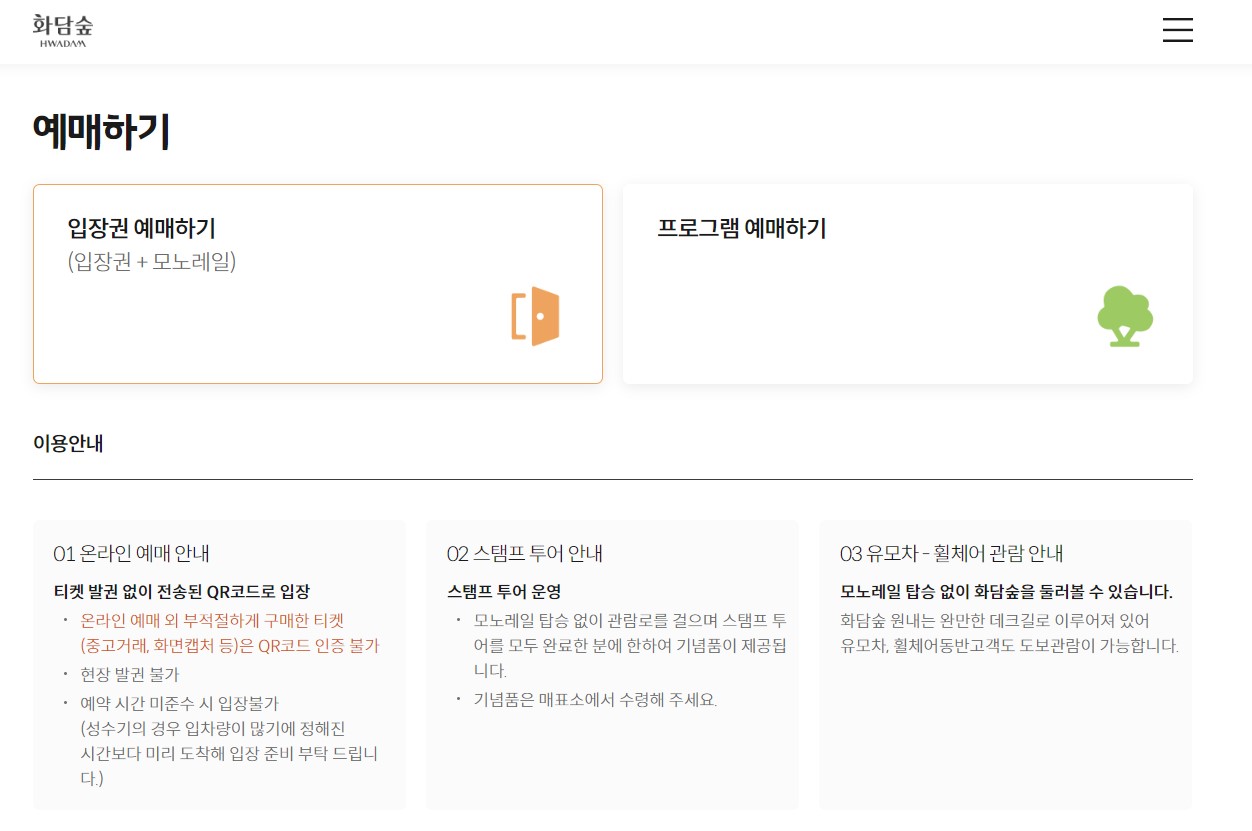 입장권 예매하기 화면에 들어가면 위와 같은 입장권 예매하기 화면이 나옵니다. 입장권과 모노레일을 날짜와 시간을 지정해 예매할 수 있습니다.