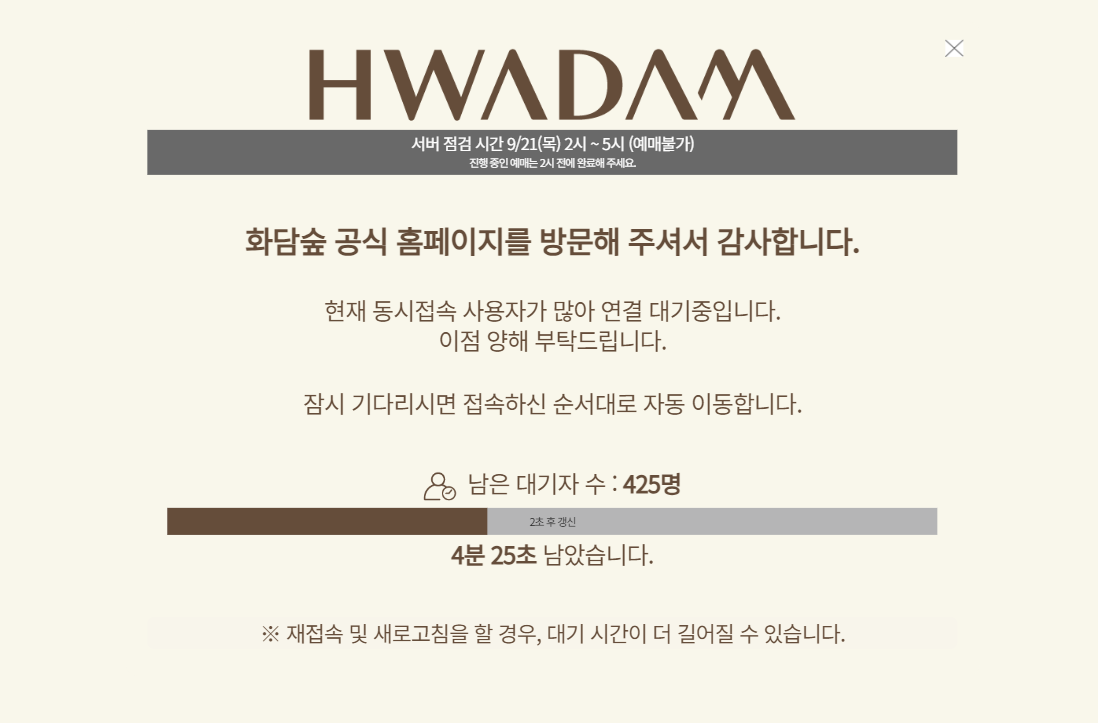 예매하기를 클릭하면 대기화면이 나옵니다. 제가 낮에 입장 예매 대기인원을 체크했을때는 천명이 넘어갔는데요. 새벽 1시쯤 예매사이트에 접속하니 인원이 백명대로 줄어들었어요. 대략 대기인원 1명당 1초로 계산하면 되는데 425명이 대기자수니 4분 25초정도 있네요.