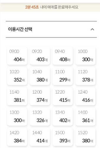 시간은 20분단위로 예매가능하며 3분이내로 결정하셔야합니다. 저는 시간을 변경하려 뒤로가기 버튼을 눌렀다가 다시 처음대기화면이 떠서 당황스러웠어요. 꼭 날짜와 시간 결정하셔서 들어가시기 바랍니다.