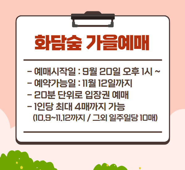 가을단풍시즌 화담숲의 예매는 따로 예매가능날짜가 있는데 바로 9월 20일 오후 1시부터입니다.