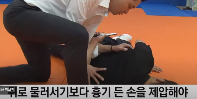 뒤로 물러나다가 찔릴 수가 있고 배를 맞을 경우에 치명상을 입을 수 있기 때문에 흉기든 손을 제압할 수 있다면 뒤로 물러나는 것보다 낫습니다.