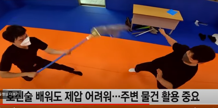 사실 이런 일을 겪어보지 않은 사람이 막상 흉기를 든 사람과 마주쳤을 때 이럴 정신이 있을까 싶기는 한데 의자든 청소용품이든 내 주변에 있는 물건들로 흉기든 남자를 대응합니다. 호신술을 배웠다 해도 제압한다는 건 어렵기 때문에 주변의 물건을 활용해 대응하는 게 중요합니다. 흉기보다 긴 물건을 이용해 거리를 벌려야 피해를 줄일 수 있습니다.