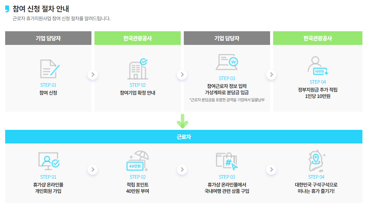 근로자가 20만원을 내면 기업이 10만원 정부가 10만원을 지원해서 40만원의 여행자금을 마련할 수 있는 제도입니다. 추가모집기간은 9월 6일부터 22일까지며 근로자휴기지원사업 홈페이지에서 신청하실 수 있습니다. 중소기업이나 소상공인, 사회복지법인이나 시설 근로자일 경우 해당되며 부여된 포인트는 12월 29일까지 사용가능합니다.