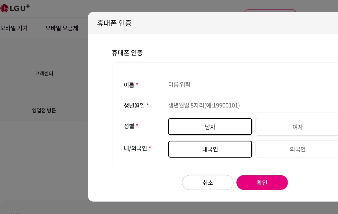 LG U+의 경우에도 이름과 생년월일, 성별과 내국인 설정을 바르게 한 후 자주색 확인버튼을 누르면 조회가능합니다.