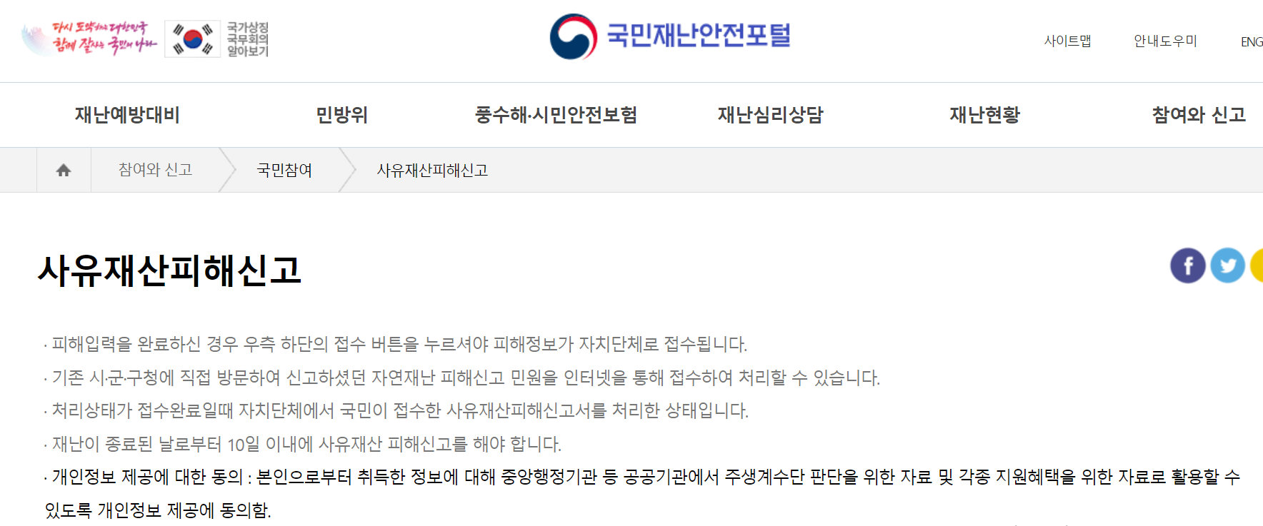 사유재산 피해신고는 국민재난안전포털 사이트에 들어가서 제일 오른쪽 카테고리 참여와 신고 클릭 후 사유재산피해신고로 들어가면 됩니다.